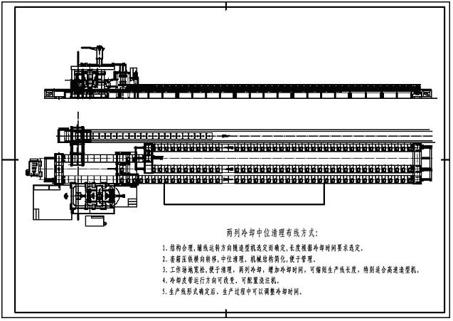 1.1 結(jié)構(gòu)合理,輔線運(yùn)轉(zhuǎn)方向隨造型機(jī)選定而確定,長度根據(jù)冷卻時(shí)間要求選定。