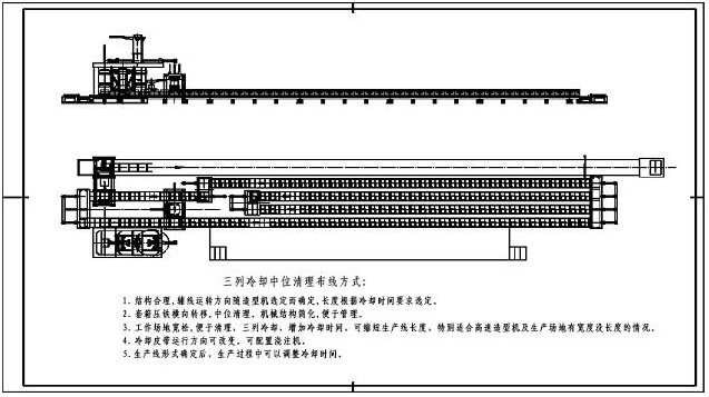 3.1 結(jié)構(gòu)合理,輔線運(yùn)轉(zhuǎn)方向隨造型機(jī)選定而確定,長度根據(jù)冷卻時(shí)間要求選定。